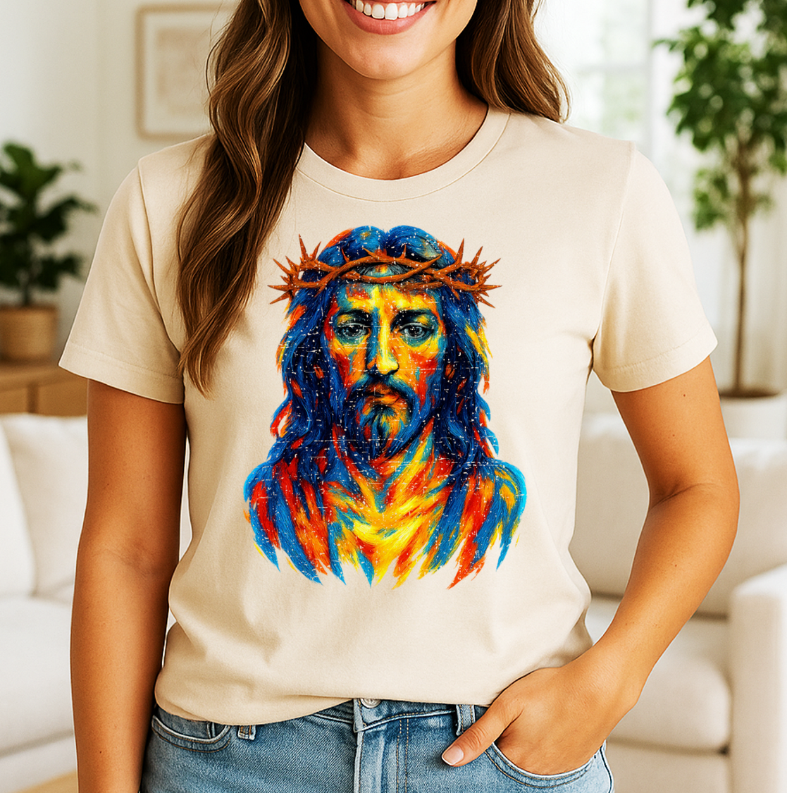 A powerful blend of faith and color, our Painted Jesus t-shirt features a striking portrait of Christ rendered in expressive, vibrant brushstrokes. This one-of-a-kind design captures deep emotion and reverence through modern artistic style, making it more than a shirt — it’s a wearable statement of devotion and creativity.