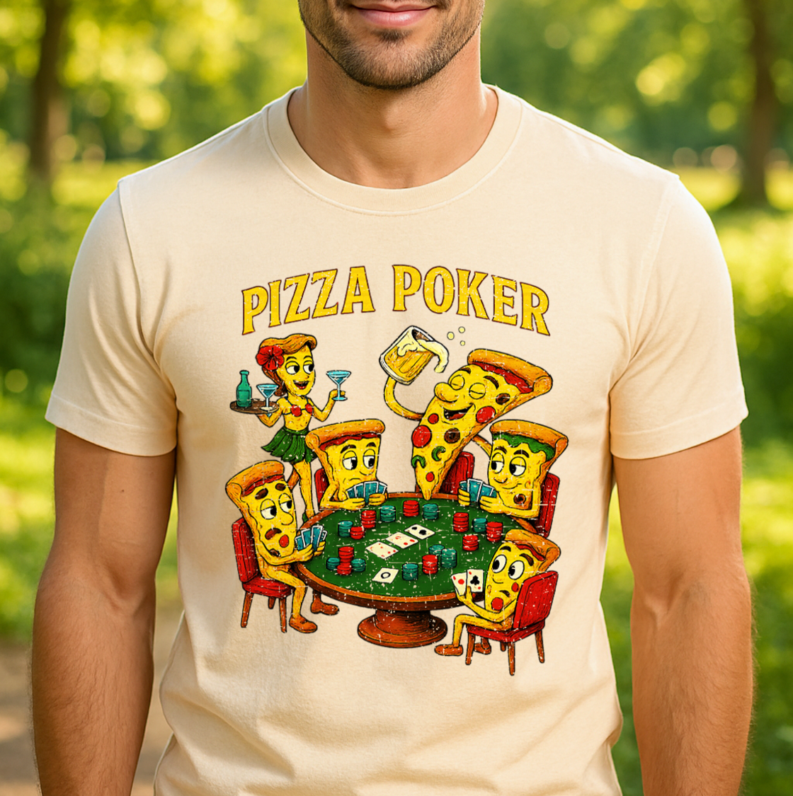 pizza t-shirt, funny food shirt, novelty poker tee, retro graphic shirt, unisex pizza shirt, pizza lover gift, gambling graphic tee, best-selling t-shirt